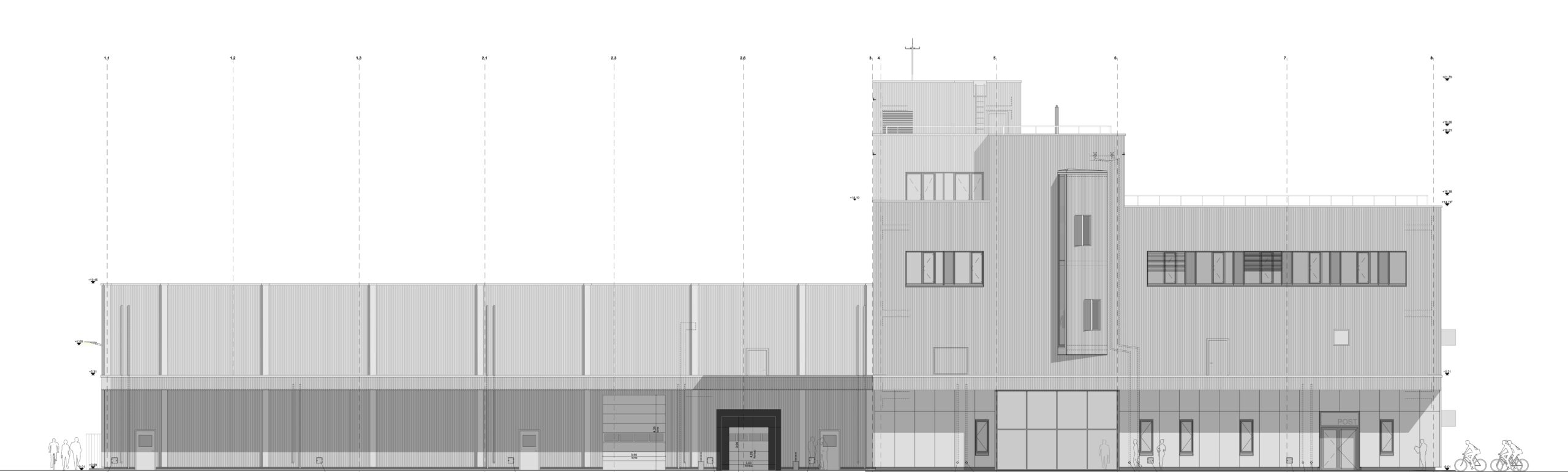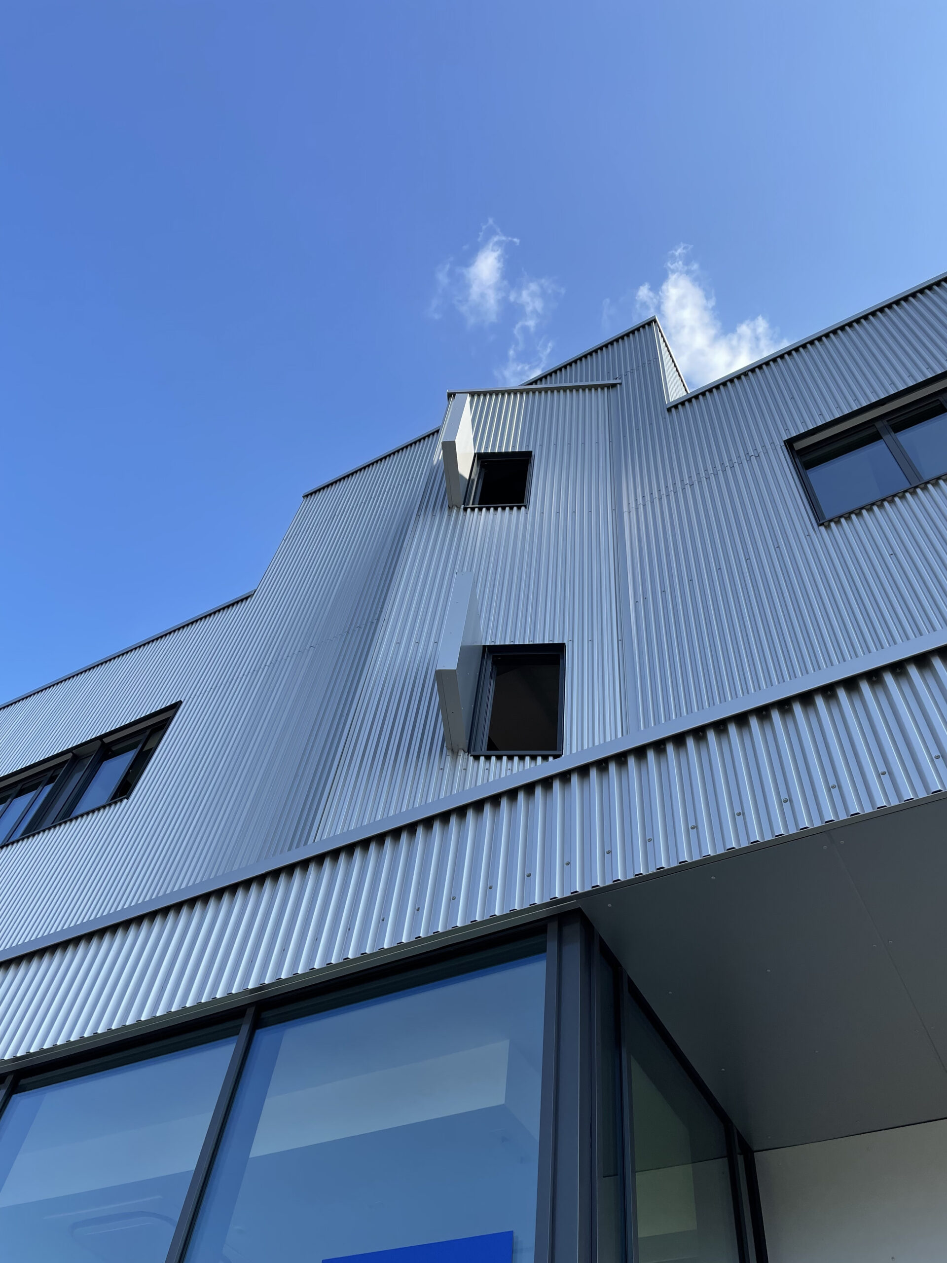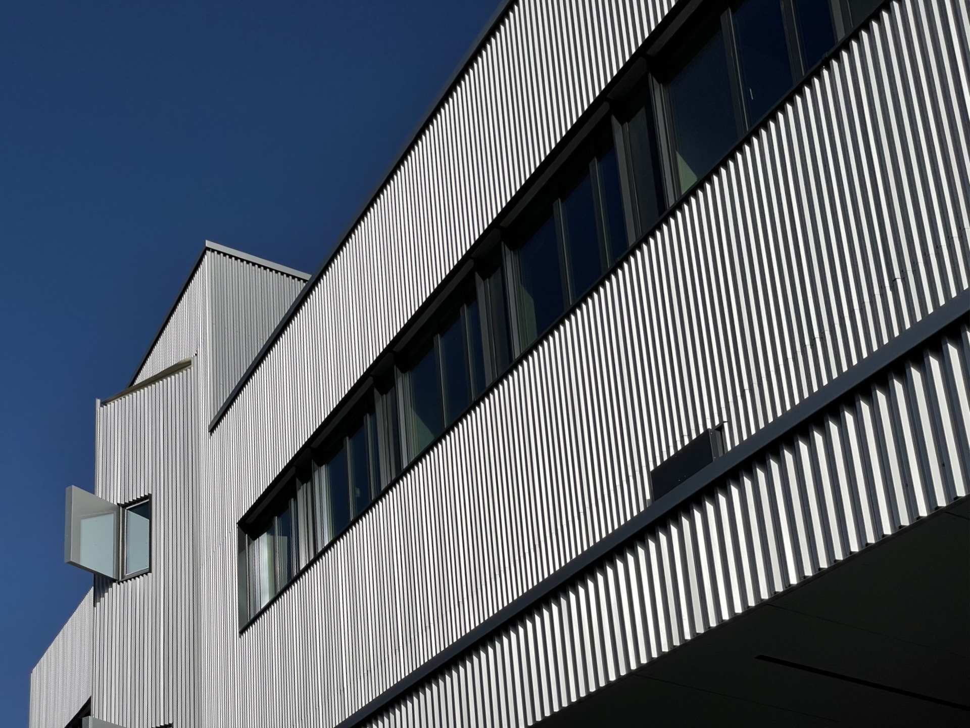 Bei dem Neubau handelt es sich um ein L-Förmiges Gebäude mit unterschiedlichen Höhenniveaus. Diese Komposition aus unterschiedlichen Höhen macht, einerseits die innere Zonierung nach außen hin sichtbar, andererseits gliedert sie das Bauwerk.