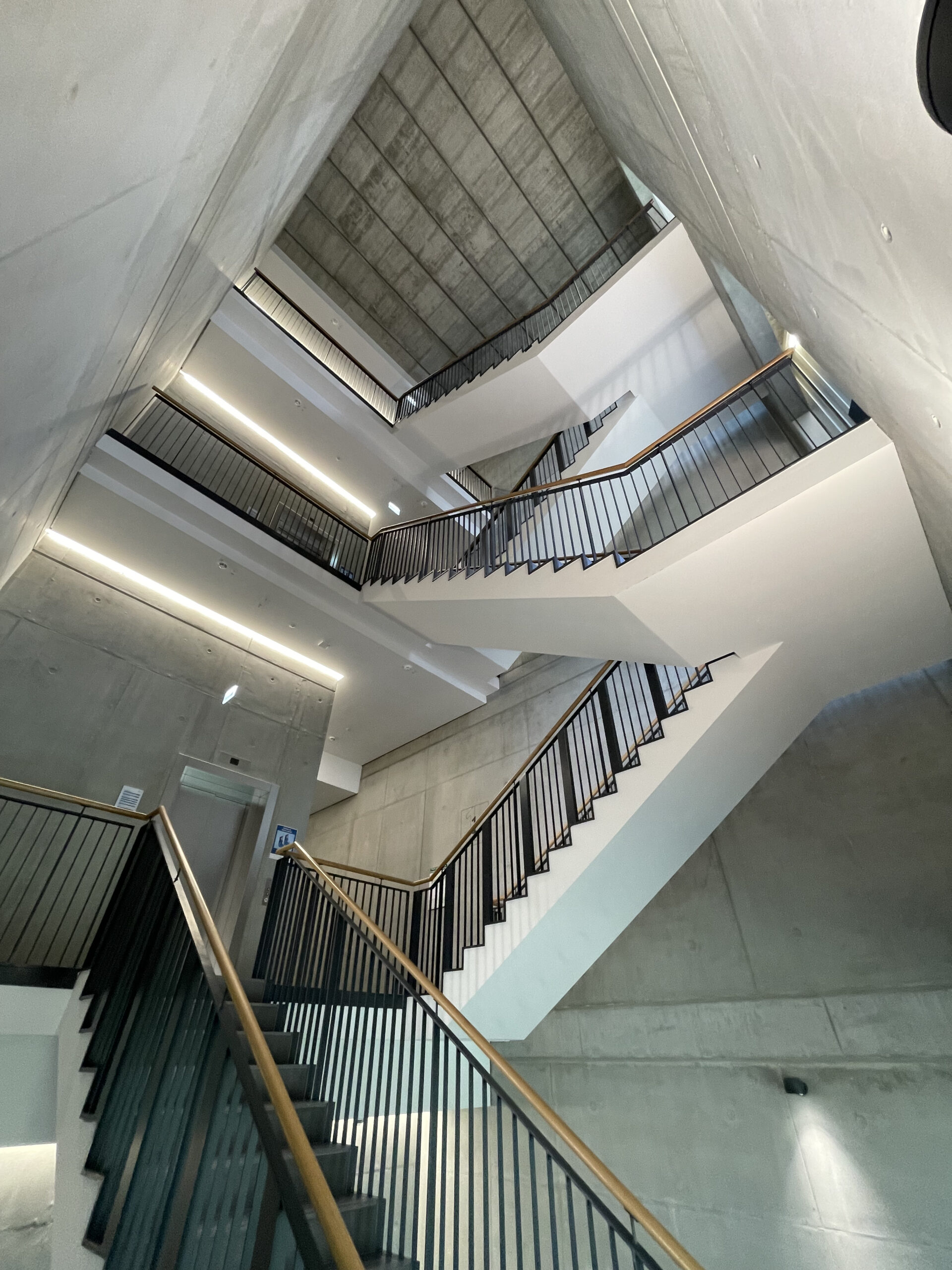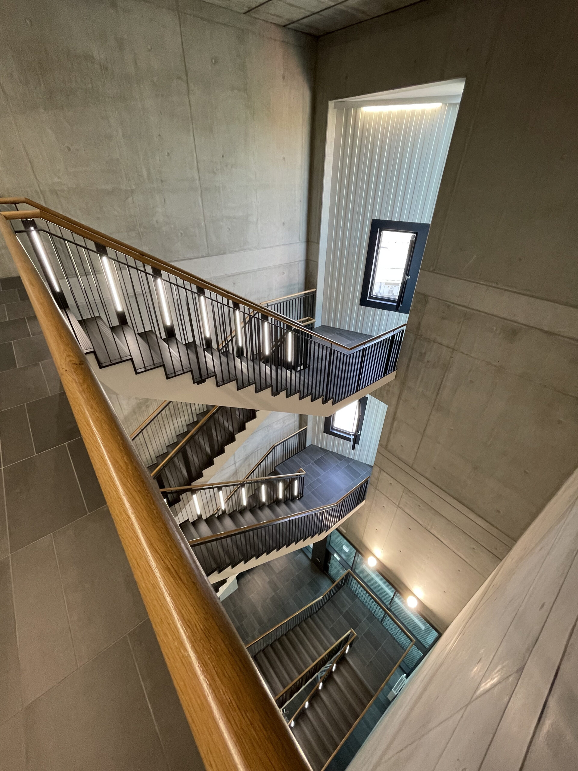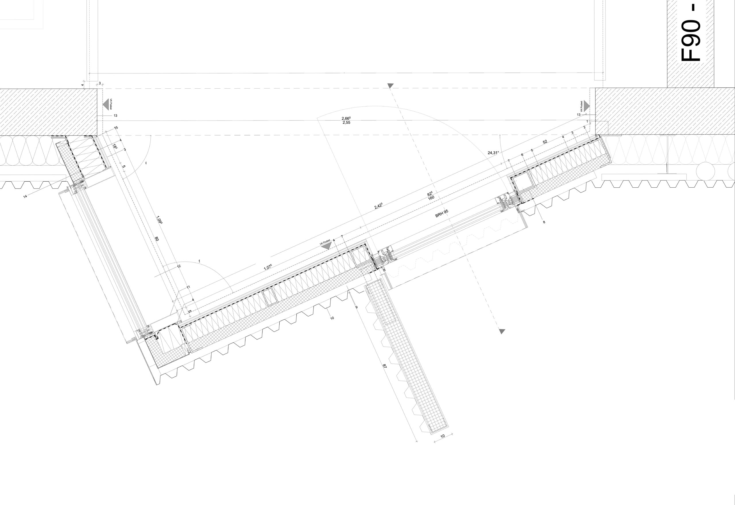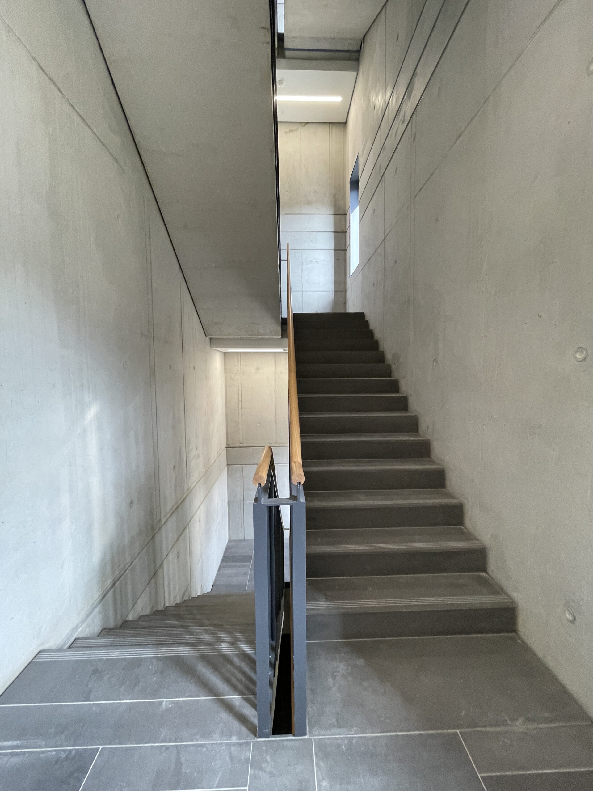 Bei dem Neubau handelt es sich um ein L-Förmiges Gebäude mit unterschiedlichen Höhenniveaus. Diese Komposition aus unterschiedlichen Höhen macht, einerseits die innere Zonierung nach außen hin sichtbar, andererseits gliedert sie das Bauwerk.