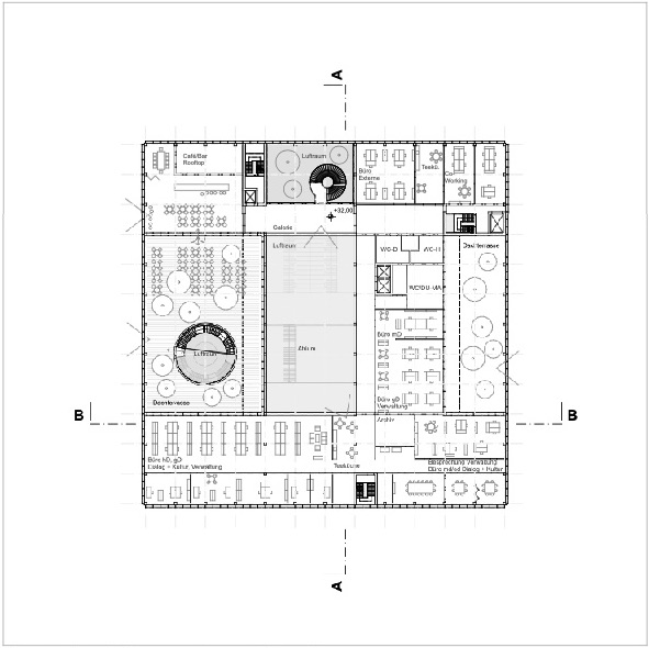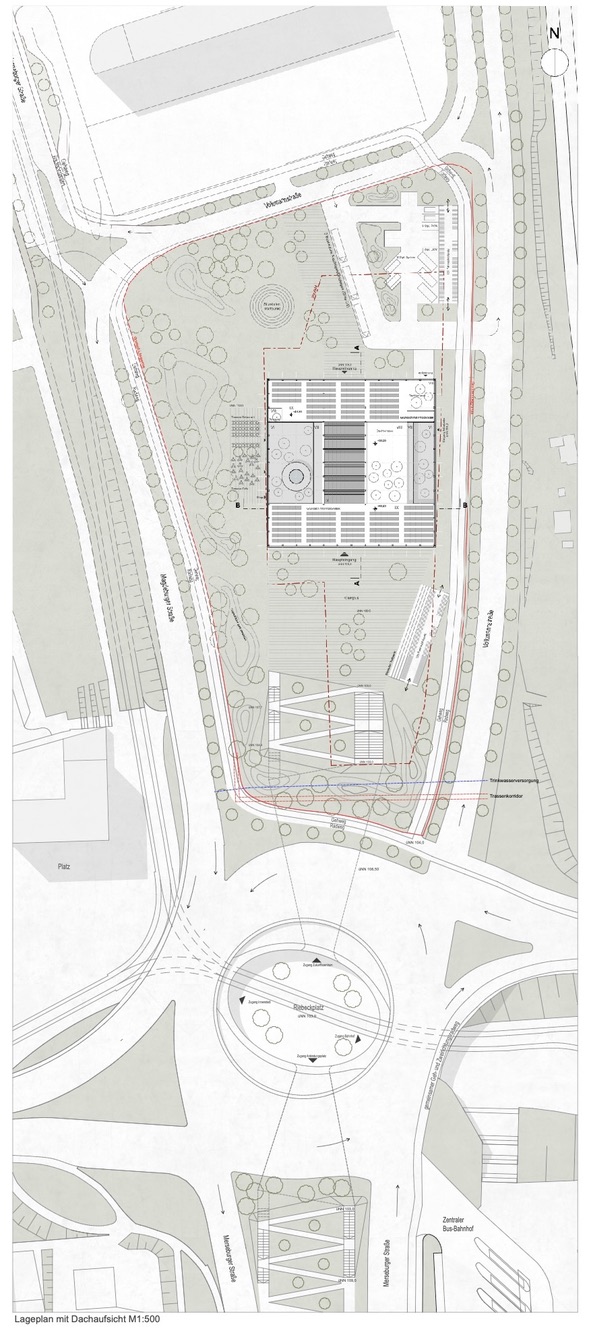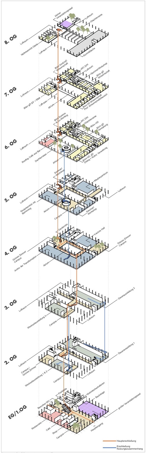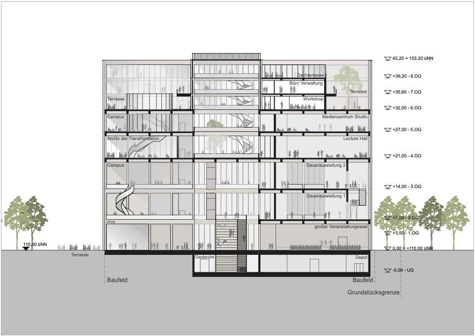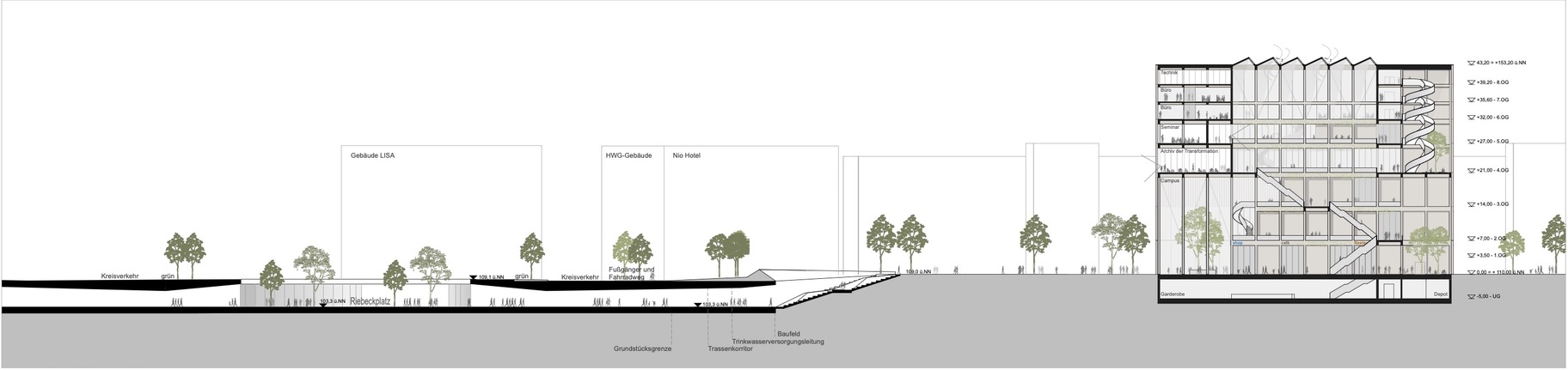 Der Neubau des Zukunftszentrums setzt mit einem 43 m hohen, monolithischen Kubus ein markantes städtebauliches Zeichen am Riebeckplatz und transformiert eine von Verkehrsbauten und Brüchen geprägte urbane Insel in einen offenen, identitätsstiftenden Parkraum. Die gleichwertig erschlossenen Gebäudeseiten ermöglichen eine demokratische Zugangskultur, während das zentrale Atrium als vertikaler Campus alle Geschosse räumlich und funktional verknüpft. Die Raumorganisation folgt einem offenen, flexiblen Konzept mit Ausstellungsflächen, Veranstaltungsbereichen, einem öffentlich zugänglichen Restaurant sowie wissenschaftlichen und pädagogischen Einrichtungen, die durch Atrien, Rampen und Sichtbeziehungen vernetzt sind. Der Bau nutzt eine CO₂-reduzierte Holz-Hybrid-Konstruktion mit Sichtbezug zu Transformation, Nachhaltigkeit und Zukunft. Ein Lowtech-Klima- und Lüftungskonzept mit natürlicher Belichtung, Nachtauskühlung und PV-bestücktem Holzlamellen-Sonnenschutz minimiert den Energiebedarf. Die Freiraumgestaltung setzt auf extensive Begrünung, Versickerung, Regenwassernutzung und die Integration in die Topografie, wodurch ein ökologisch wirksamer, offener Stadtraum entsteht. So wird der Ort selbst zur gebauten Metapher für Wandel, Verbindung und zukunftsgerichtetes Denken.