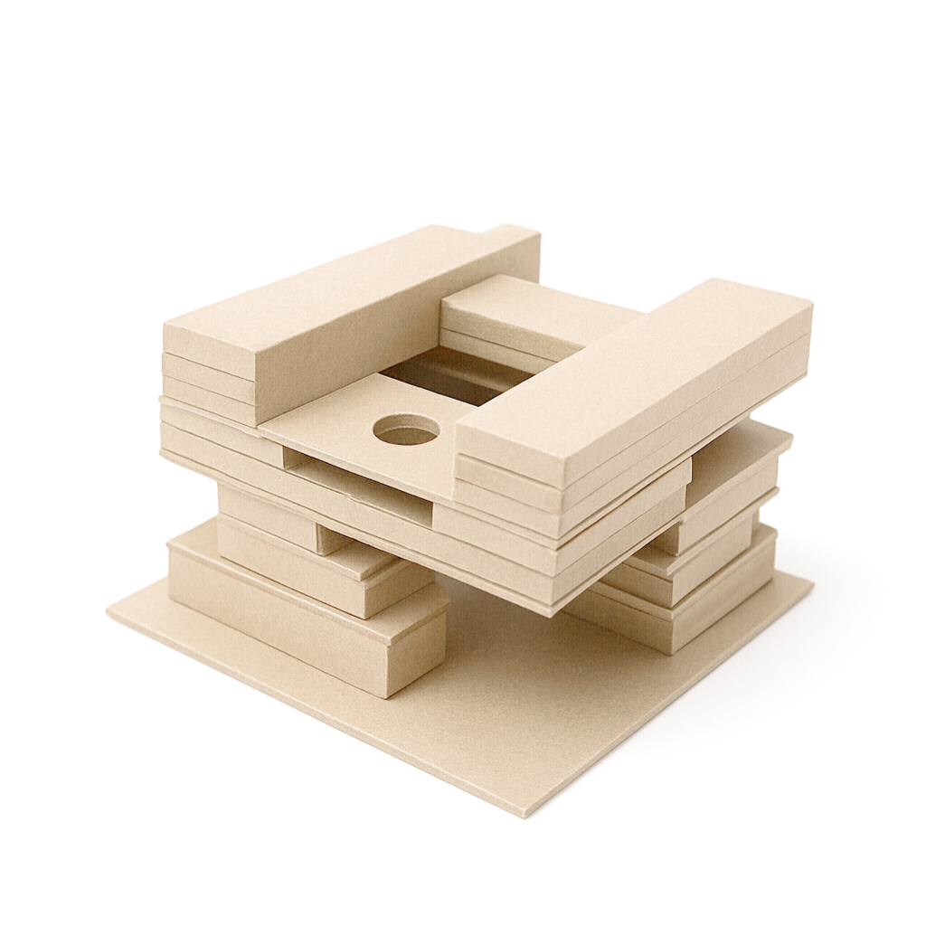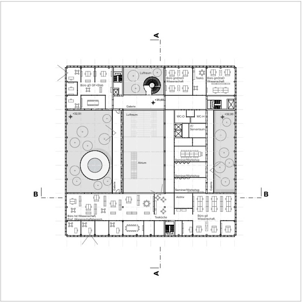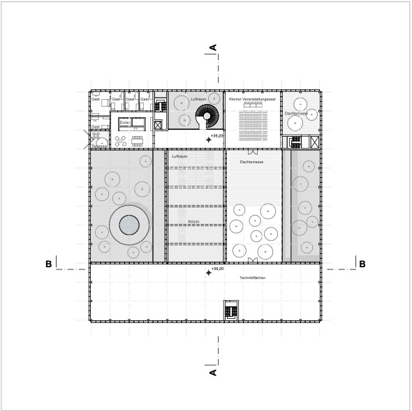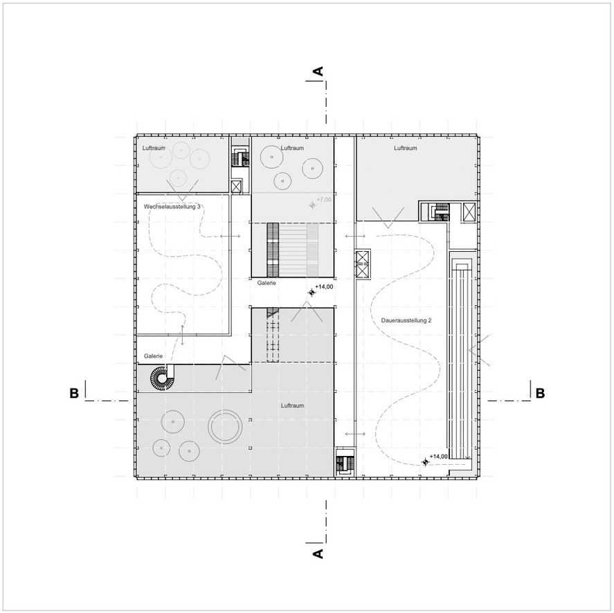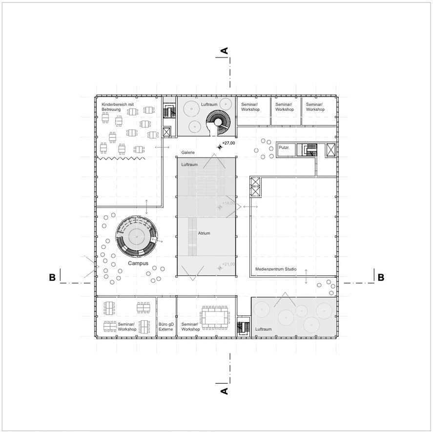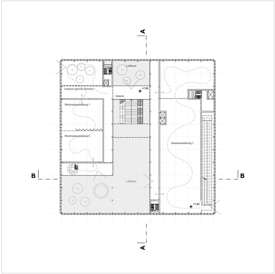 Der Neubau des Zukunftszentrums setzt mit einem 43 m hohen, monolithischen Kubus ein markantes städtebauliches Zeichen am Riebeckplatz und transformiert eine von Verkehrsbauten und Brüchen geprägte urbane Insel in einen offenen, identitätsstiftenden Parkraum. Die gleichwertig erschlossenen Gebäudeseiten ermöglichen eine demokratische Zugangskultur, während das zentrale Atrium als vertikaler Campus alle Geschosse räumlich und funktional verknüpft. Die Raumorganisation folgt einem offenen, flexiblen Konzept mit Ausstellungsflächen, Veranstaltungsbereichen, einem öffentlich zugänglichen Restaurant sowie wissenschaftlichen und pädagogischen Einrichtungen, die durch Atrien, Rampen und Sichtbeziehungen vernetzt sind. Der Bau nutzt eine CO₂-reduzierte Holz-Hybrid-Konstruktion mit Sichtbezug zu Transformation, Nachhaltigkeit und Zukunft. Ein Lowtech-Klima- und Lüftungskonzept mit natürlicher Belichtung, Nachtauskühlung und PV-bestücktem Holzlamellen-Sonnenschutz minimiert den Energiebedarf. Die Freiraumgestaltung setzt auf extensive Begrünung, Versickerung, Regenwassernutzung und die Integration in die Topografie, wodurch ein ökologisch wirksamer, offener Stadtraum entsteht. So wird der Ort selbst zur gebauten Metapher für Wandel, Verbindung und zukunftsgerichtetes Denken.